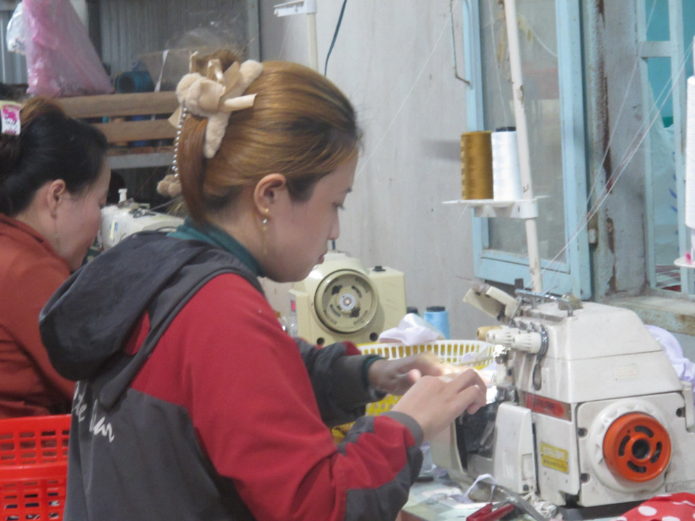 Chị Nhi tâm sự: “Ban đầu, tôi làm nhiều công việc như tách vỏ hạt điều, may giày,... nhưng thu nhập không ổn định. Vì vậy, tôi mạnh dạn mua sắm máy may và máy vắt sổ rồi tìm đầu mối nhập hàng về may gia công”.