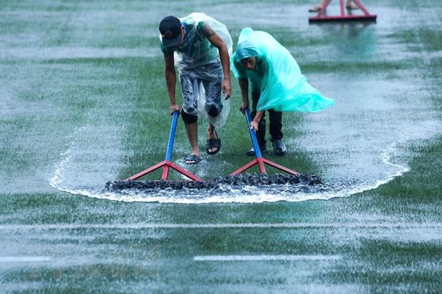 Các nhân viên tại sân đang cố gắng đẩy nước ra ngoài. (Nguồn: TTXVN)