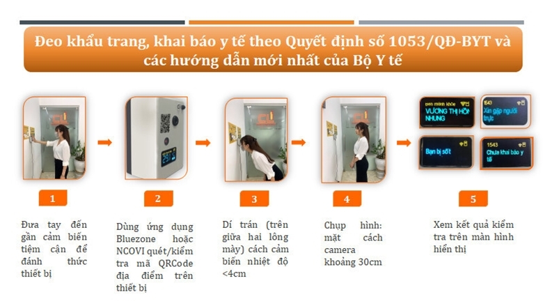Theo đó, người thực hiện quét kiểm tra y tế chỉ cần đứng cách cảm biến 3 cm để đo nhiệt độ, sau đó, cung cấp mã QR cá nhân hoặc chụp mã QR địa điểm là thiết bị sẽ tự động báo thân nhiệt, cấp độ nguy cơ dịch (trên cơ sở dữ liệu khai báo y tế, lịch sử dịch tễ, tiêm vaccine, xét nghiệm)… của người dân từ cổng dữ liệu qr.tokhaiyte.vn hiển thị trên màn hình. Người không đủ điều kiện qua cửa sẽ có chuông báo, màn hình sẽ báo lý do (sốt, cấp độ nguy cơ dịch cao…).