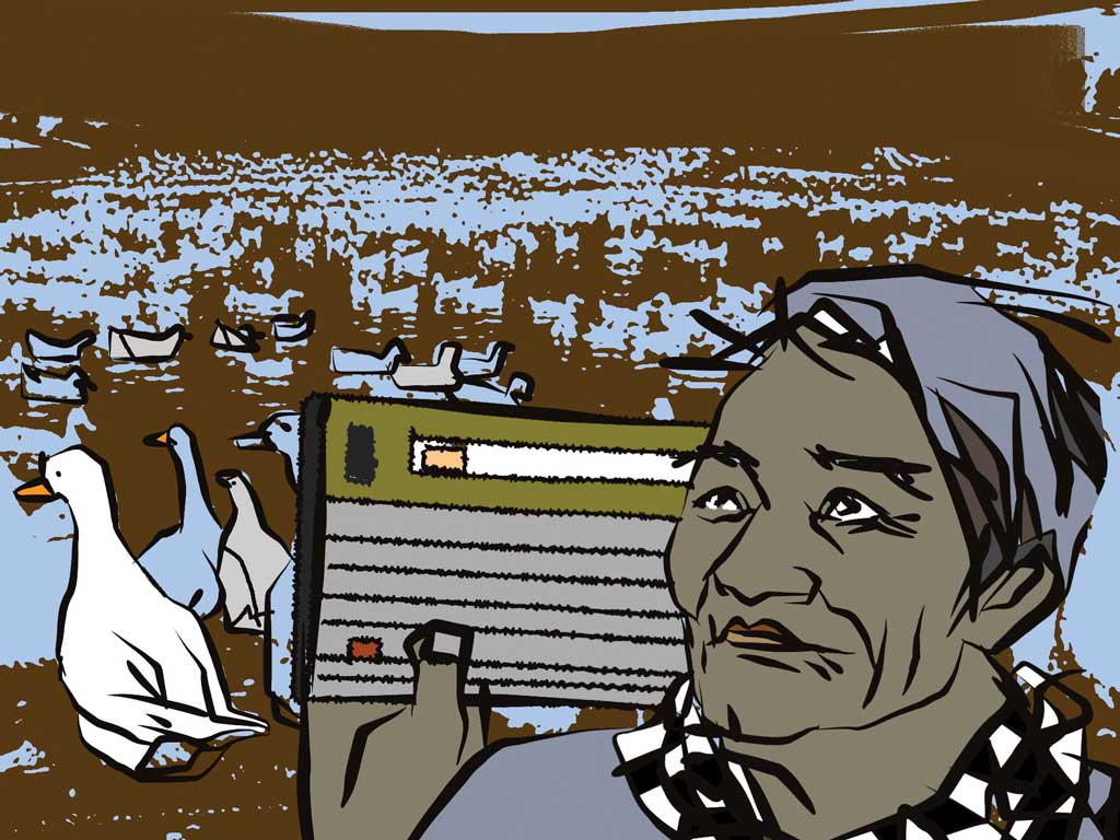 Có lần, thằng con Út chợt nghĩ, trong đồng nuôi vịt, ông già có ai làm bạn ngoài một chiếc radio? Sáng, sau khi lượm hột vịt xong thì bật lên là vừa. Lùa vịt ra đồng cũng kè kè trong túi áo cái radio để lát nữa cắm lưới xong thì nghe hát cải lương. Tối tối, buồn quá, vừa nghe, vừa gật gù nhậu mình ên.
