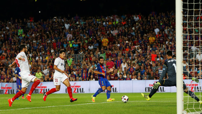 Với thắng lợi 2-0 ở trận lượt đi, Barcelona chơi khá nhàn nhã trong trận lượt về. Tuy nhiên, thầy trò HLV Luis Enrique cũng sớm có bàn thắng khi Sevilla bộc lộ nhiều sơ hở trong phòng ngự. Phút thứ 10, từ lên bóng ở trung lộ, Arda Turan xâm nhập vòng cấm đón đường chuyền của Messi rồi thực hiện pha sửa bóng vào góc xa hạ thủ môn Rico, mở tỉ số trận đấu.