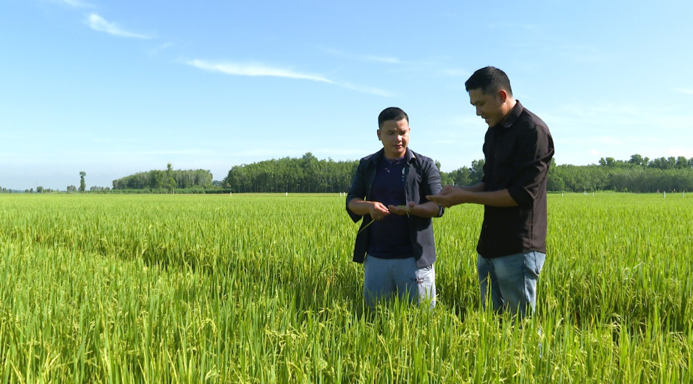 Kỹ sư Công ty Cổ phần Sản xuất Thương mại Lúa Vàng Việt kiểm tra lúa