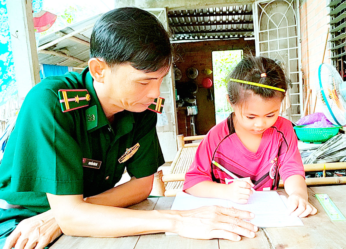 Thiếu tá Nguyễn Văn Hô hướng dẫn em Lê Nguyễn Cát Tường học bài