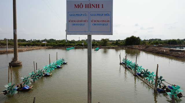 Một mô hình nuôi tôm ở Sóc Trăng được thí điểm điều chỉnh thiết bị dàn quạt tạo ôxy - Ảnh: Đình Hoàng