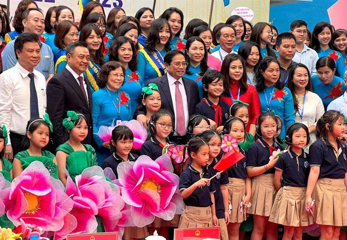 | Thủ tướng Phạm Minh Chính chụp ảnh lưu niệm với thầy và trò Trường Tiểu học Đoàn Thị Điểm. Ảnh: Báo Tiền phong |