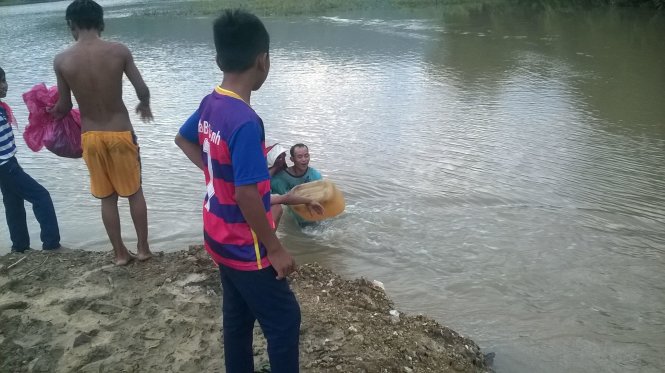 Những em tuổi lớn hơn bỏ áo quần, cặp sách vào một bịch nilông rồi tự bơi, còn những em nhỏ tuổi thì cha mẹ phải cõng để bơi qua sông. Các thầy cô được trường huy động đứng ở bờ bên này để đón, đưa các em.