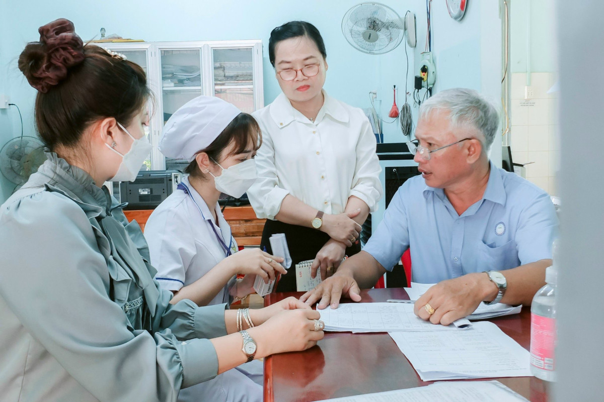 Bác sĩ Trần Huỳnh Đức (bìa phải) giám sát cán bộ y tế huyện Tân Trụ sau đào tạo Quản lý bệnh nhân đái tháo đường