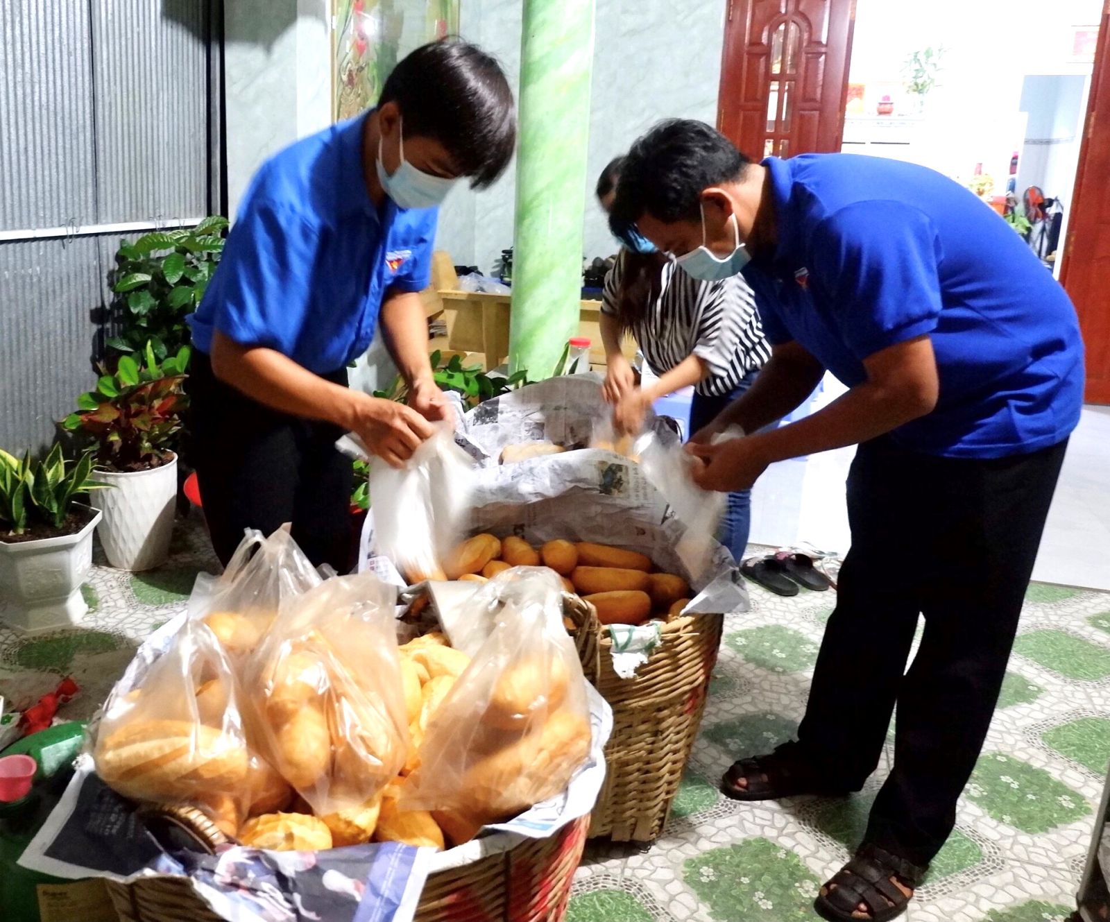 Xe bánh mì được đặt trước nhà anh Võ Ngọc Chiến - Trưởng khu phố 3, thị trấn Tầm Vu. Vợ chồng anh Chiến cũng là người trực tiếp làm ra những ổ bánh mì. Buổi tối, vợ chồng anh chuẩn bị bột, đến 2 giờ thức dậy nướng bánh. Đến 5 giờ, cơ bản hoàn thành để phát cho người dân.
