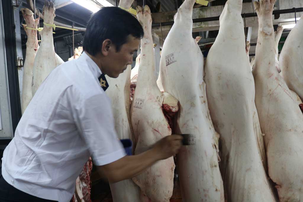 Trước khi giết mổ, cán bộ yêu cầu các công nhân của lò mổ phải vệ sinh sạch sẽ GSGC. Trong quá trình giết mổ, anh em kiểm tra các bộ phận, nội tạng của động vật có gì khác thường hay không. Khi mổ xong, tiến hành việc cắt khám thịt, đóng dấu kiểm soát giết mổ và xác nhận sản phẩm an toàn. Cán bộ giám sát việc vận chuyển lên phương tiện (có tủ đông lạnh theo quy định) và cấp giấy kiểm dịch theo đúng số lượng vận chuyển, tiếp tục niêm phong phương tiện, sát trùng phương tiện để vận chuyển về nơi tiêu thụ. Cuối cùng, anh em vào sổ kiểm tra, theo dõi.