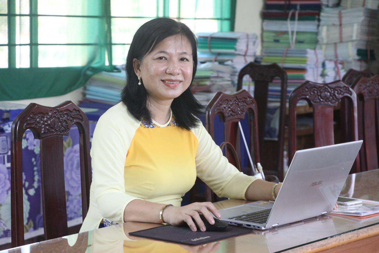 Tất cả giáo án của cô đều soạn trên máy vi tính, các tiết thao giảng đều dạy bằng giáo án điện tử. Cô cũng tham mưu Ban Giám hiệu nhà trường tổ chức tập huấn các chuyên đề ứng dụng công nghệ thông tin trong giảng dạy cho giáo viên toàn trường như cách tạo các video, clip và chèn vào bài giảng; cách liên kết bài giảng với Internet, với các trang hình ảnh hoặc các trang tài liệu khác; cách thiết kế trò chơi trong bài giảng Powerpoint;... Kết quả, những năm qua, 100% tiết thao giảng, thi giảng của giáo viên trong trường đều dạy bằng giáo án điện tử.
