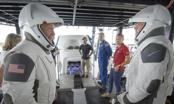Các phi hành gia của NASA Doug Hurley, trái và Bob Behnken làm việc với các đội từ NASA và SpaceX tại lưu vực Trident ở Cape Canaveral, Fla ngày ngày 13/8/2019. (Ảnh: Bill Ingalls / NASA)