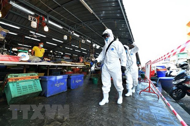 Nhân viên khử khuẩn nhằm ngăn dịch COVID-19 lây lan tại một khu chợ ở tỉnh Samut Sakhon, Thái Lan. (Ảnh: THX/TTXVN)