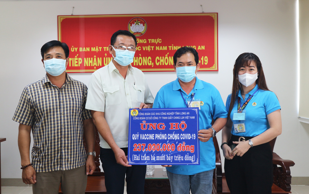 Hưởng ứng lời kêu gọi của Tỉnh ủy, HĐND, UBND, UBMTTQ Việt Nam tỉnh Long An, Công đoàn cơ sở Công ty TNHH Giầy Ching Luh Việt Nam đã vận động công nhân, người lao động quyên góp ủng hộ 237 triệu đồng cho Quỹ vắc-xin phòng Covid-19 của tỉnh.