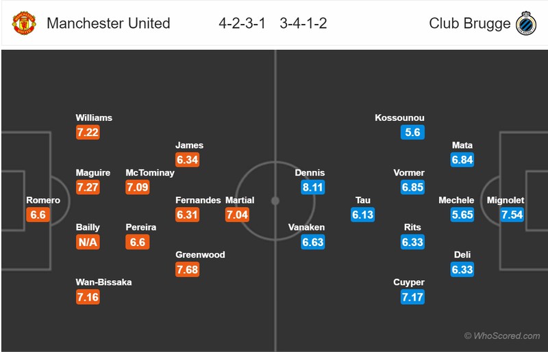 Đội hình dự kiến của MU và Brugge. (Ảnh: Whoscored)