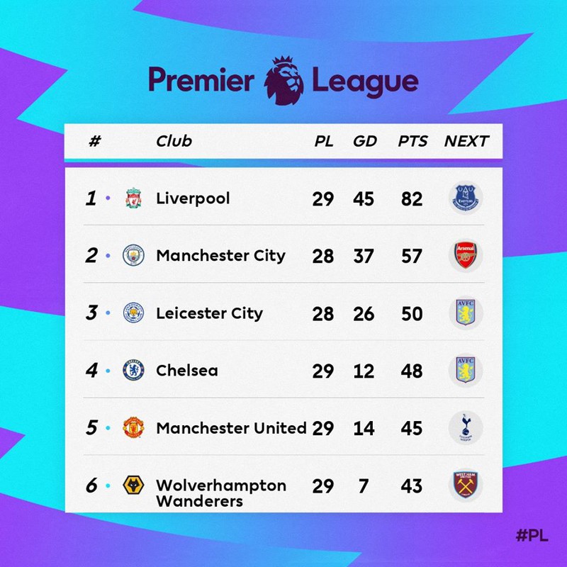 Sau vòng 29 Premier League, Liverpool vững vàng ở ngôi đầu bảng với 82 điểm. Thầy trò HLV Jurgen Klopp bỏ xa Man City ở vị trí nhì bảng tới 25 điểm nhưng chơi nhiều hơn 1 trận.