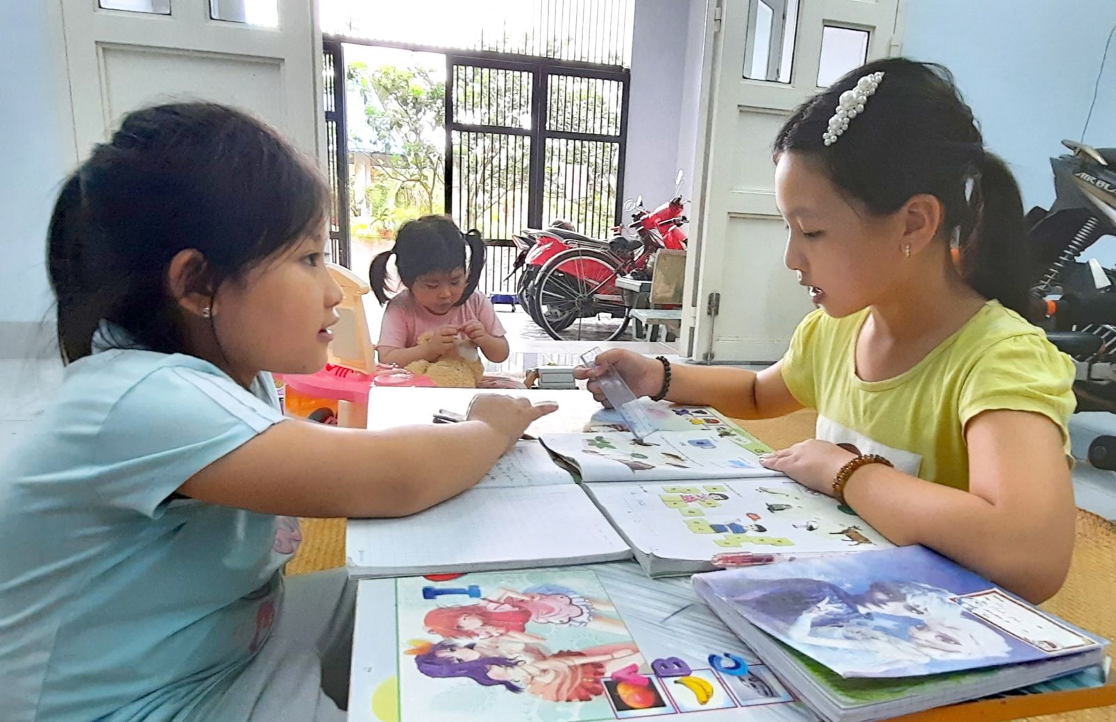 Em Nguyễn Ngọc Huỳnh Châu (bìa phải) hướng dẫn em gái học bài