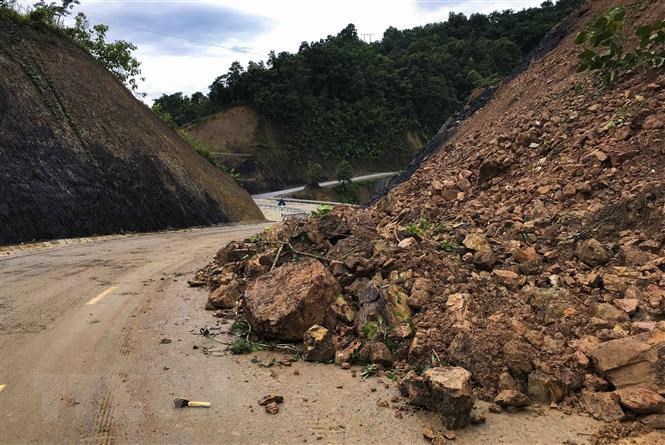 Trên địa bàn tỉnh Điện Biên xảy ra mưa lớn kéo dài khiến cho Quốc lộ 12 nối hai tỉnh Điện Biên-Lai Châu xuất hiện hơn 20 điểm sạt lở lớn nhỏ, gây cản trở cho người và phương tiện tham gia giao thông. (Ảnh: TTXVN).