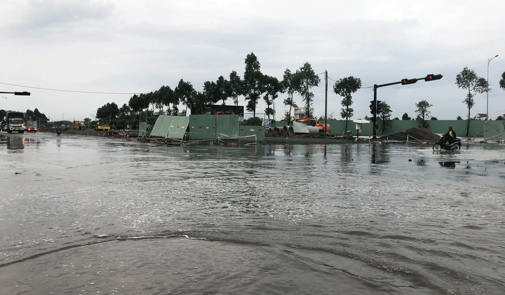 Ngã tư đường Hùng Vương (nối dài) và Quốc lộ 62 với tuyến tránh Quốc lộ 1 ngập sâu, gây khó khăn cho người tham gia giao thông