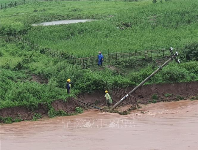 | Lực lượng Công ty Điện lực Quảng Bình khắc phục sự cố do lũ lụt. Ảnh: Đức Thọ/TTXVN |