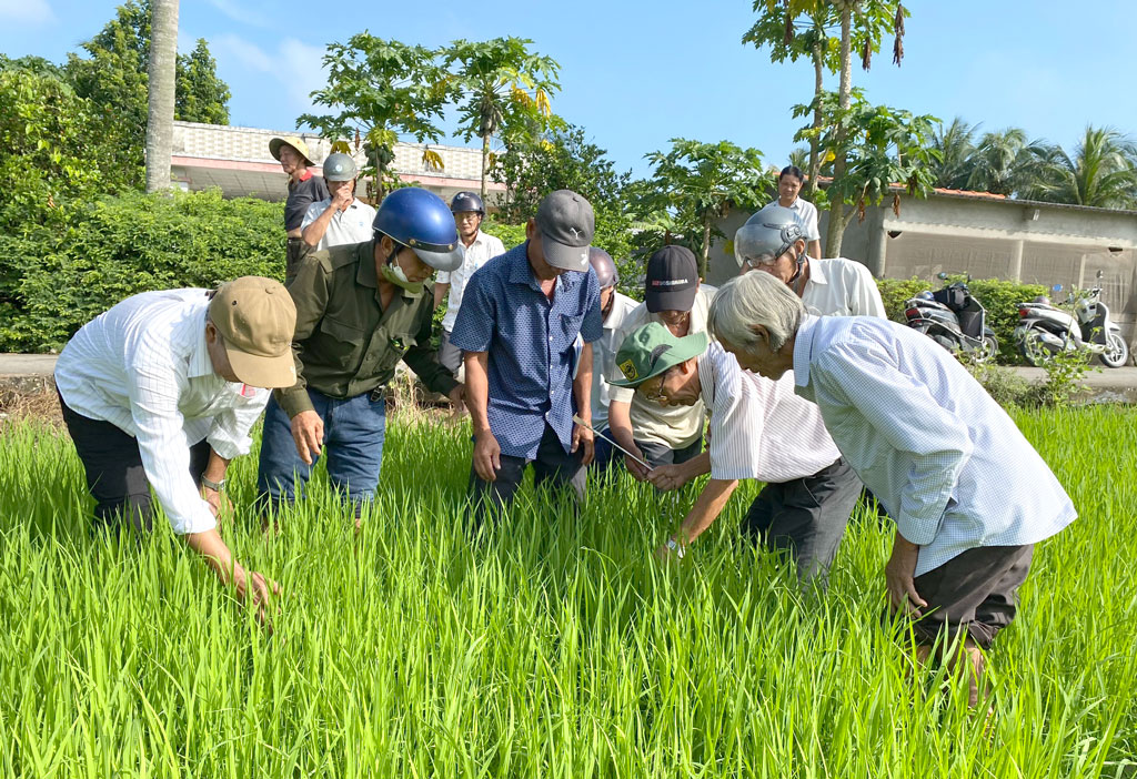 Tham gia lớp tập huấn, nông dân xã Bình Trinh Đông, huyện Tân Trụ được thực hành ngay trên đồng ruộng