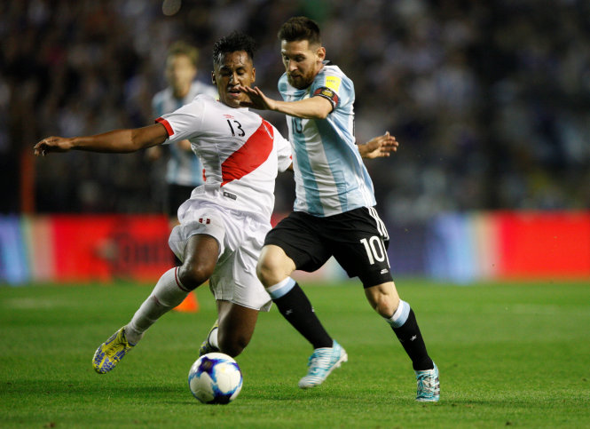 Messi bế tắc trước hàng thủ của Peru. Ảnh: REUTERS