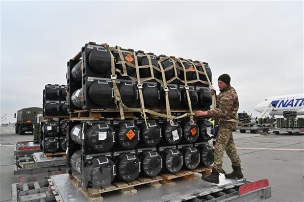 Lô tên lửa Javelins do Mỹ viện trợ được chuyển tới sân bay ở Kiev, Ukraine ngày 11/2/2022. (Ảnh: AFP/TTXVN)