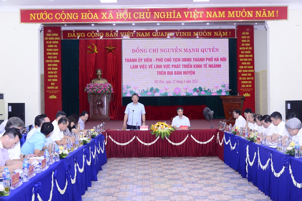 Phát biểu tại buổi làm việc, Phó Chủ tịch UBND TP Hà Nội Nguyễn Mạnh Quyền biểu dương kết quả các mặt công tác huyện Mỹ Đức đạt được trong 6 tháng qua. Đồng thời đề nghị, huyện Mỹ Đức cần tập trung hoàn thành công tác sản xuất nông nghiệp, đảm bảo công tác phòng chống lụt bão, thay đổi tư duy phát triển kinh tế nông nghiệp, từng bước xây dựng các mô hình sản xuất nông nghiệp sạch.