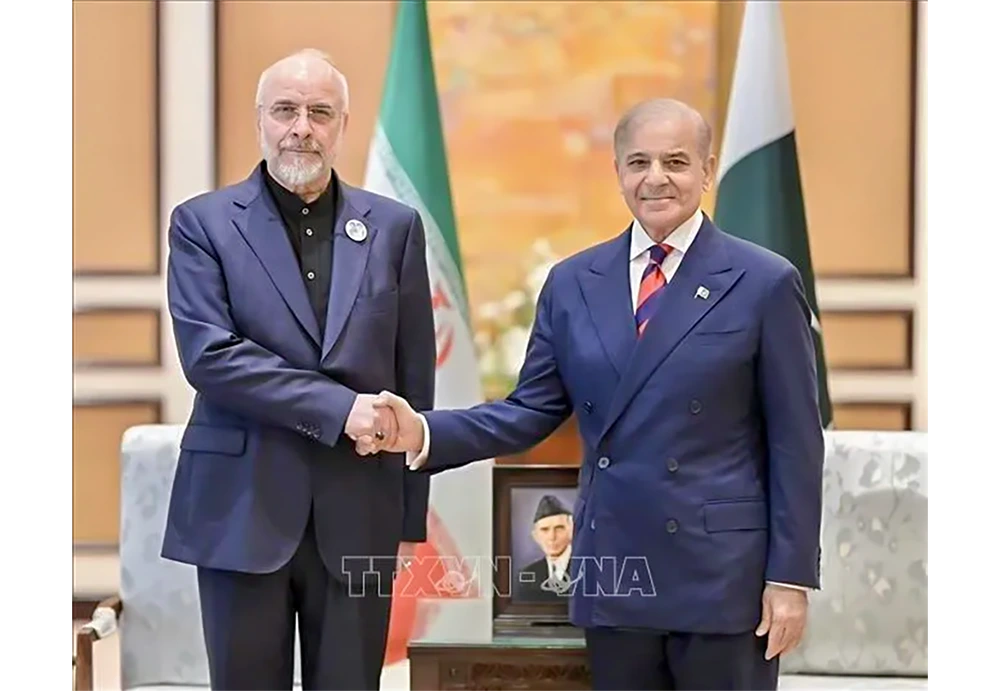 Thủ tướng Pakistan Shehbaz Sharif (phải) và Chủ tịch Quốc hội Iran Mohammad Bagher Ghalibaf tại cuộc gặp ở Islamabad.