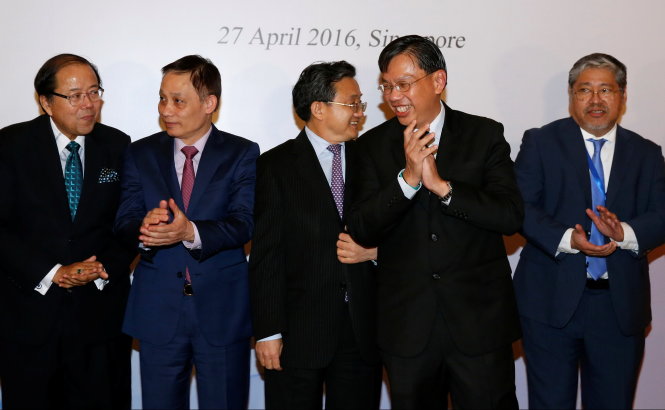 Từ trái sang: các thứ trưởng ngoại giao của Thái Lan, Việt Nam, Trung Quốc, Singapore, Philippines trong cuộc họp quan chức cấp cao liên quan Biển Đông tổ chức ở Singapore hôm 27-4 - Ảnh: Reuters