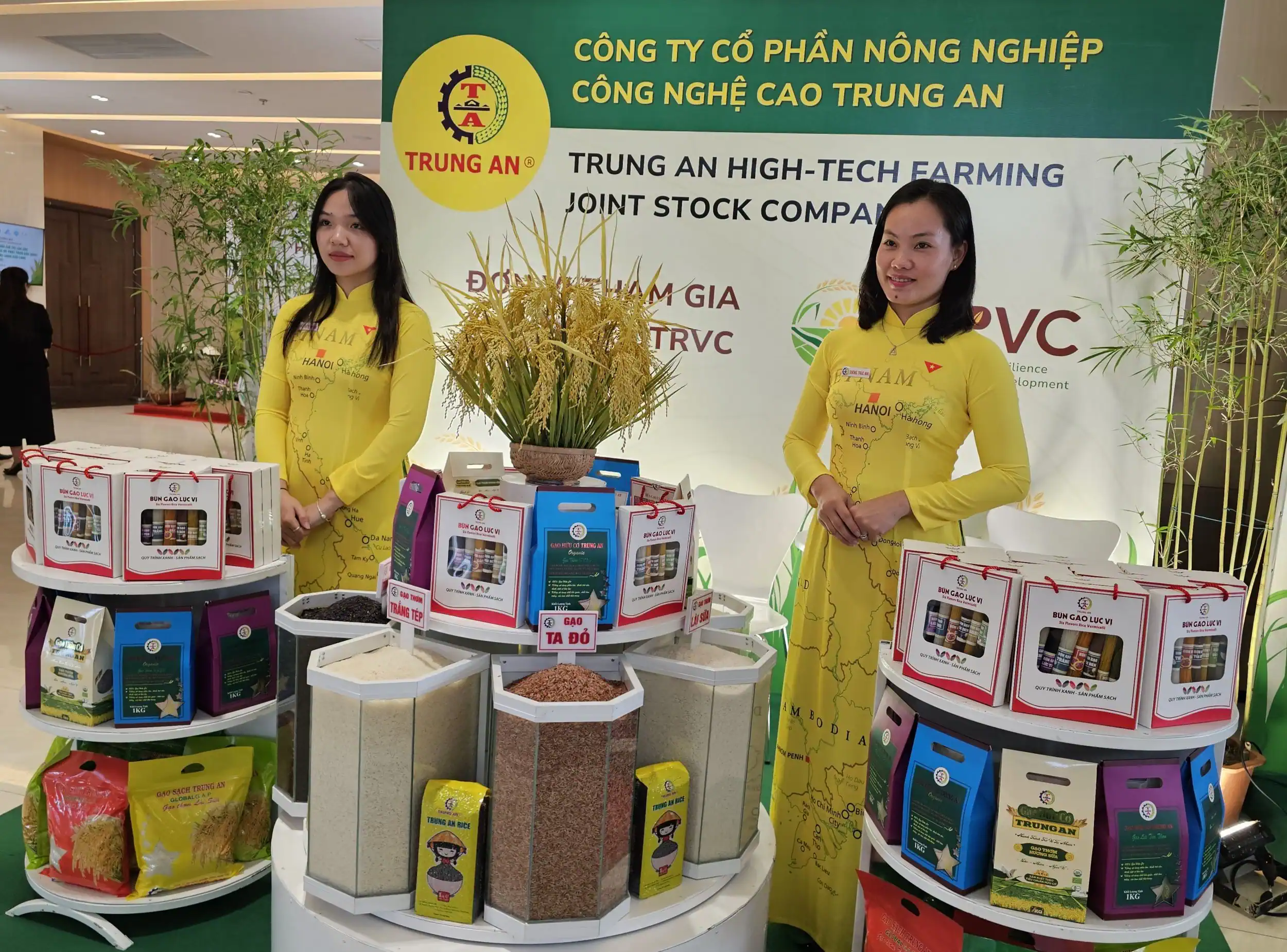 Công ty CP Nông nghiệp Công nghệ cao Trung An trưng bày, giới thiệu nhiều mặt hàng gạo tại một sự kiện triển lãm tổ chức ở Cần Thơ.