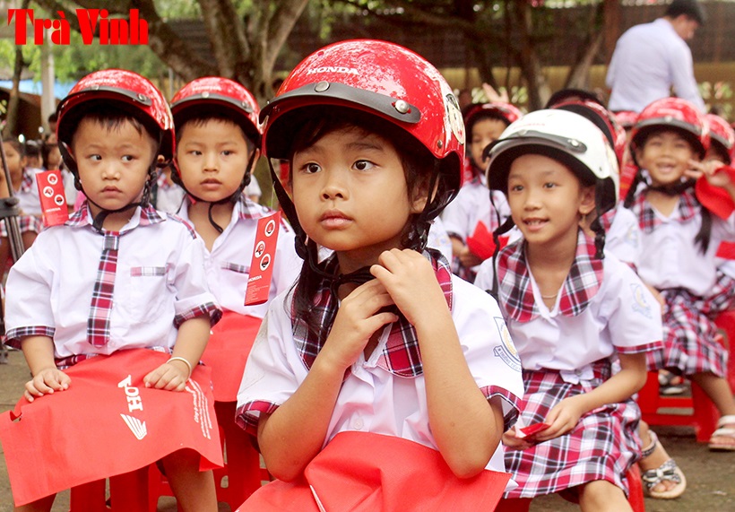 Học sinh Trường Tiểu học Nguyễn Trãi, thành phố Trà Vinh được nhận mũ tại lễ khai giảng năm học 2019-2020. Ảnh: HỒNG NHUNG