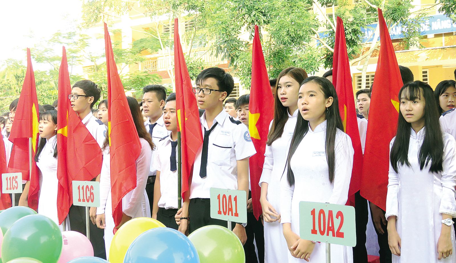 Học sinh Trường THPT Thới Long nghiêm trang trong lễ chào cờ vào ngày khai giảng năm học mới 2017-2018. Ảnh: B.NG
