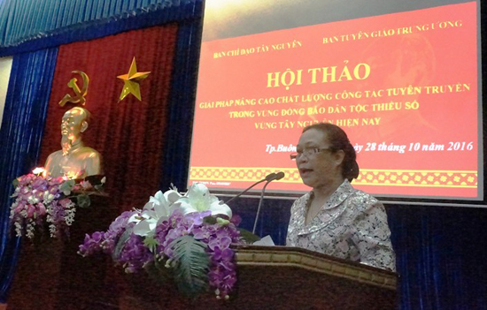 Tại Hội thảo, các đại biểu đã trao đổi, phát biểu thảo luận về những vấn đề liên quan đến tư tưởng quần chúng và kết quả công tác tuyên truyền trong vùng đồng bào DTTS ở Tây Nguyên và các địa bàn lân cận hiện nay; kinh nghiệm trong công tác tuyên truyền vùng đồng bào DTTS, vùng biên giới, vùng đồng bào có đạo, vùng di dân tái định cư và vùng kinh tế mới; công tác xây dựng và triển khai thực hiện các nghị quyết, chỉ thị của Đảng về công tác tuyên truyền; dự báo những chuyển biến về cơ cấu xã hội, vấn đề chung và đặc thù ở Tây Nguyên; đổi mới phương thức hoạt động, nâng cao chất lượng đội ngũ báo cáo viên...