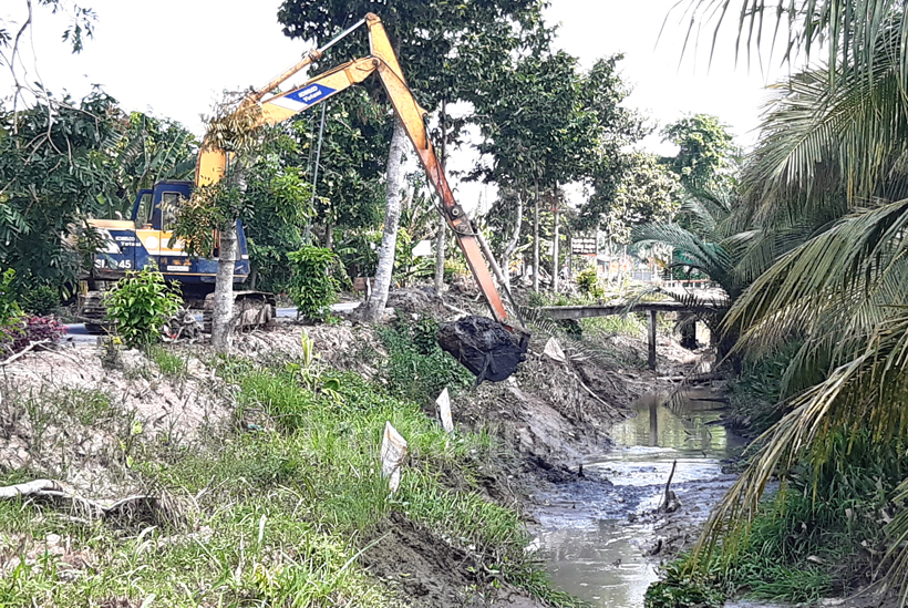 Thi công nạo vét tuyến kênh nội đồng (cặp Tỉnh lộ 915), dài gần 06km ở xã Hòa Tân, huyện Cầu Kè, phục vụ cho hơn 100ha vườn cây ăn trái.
