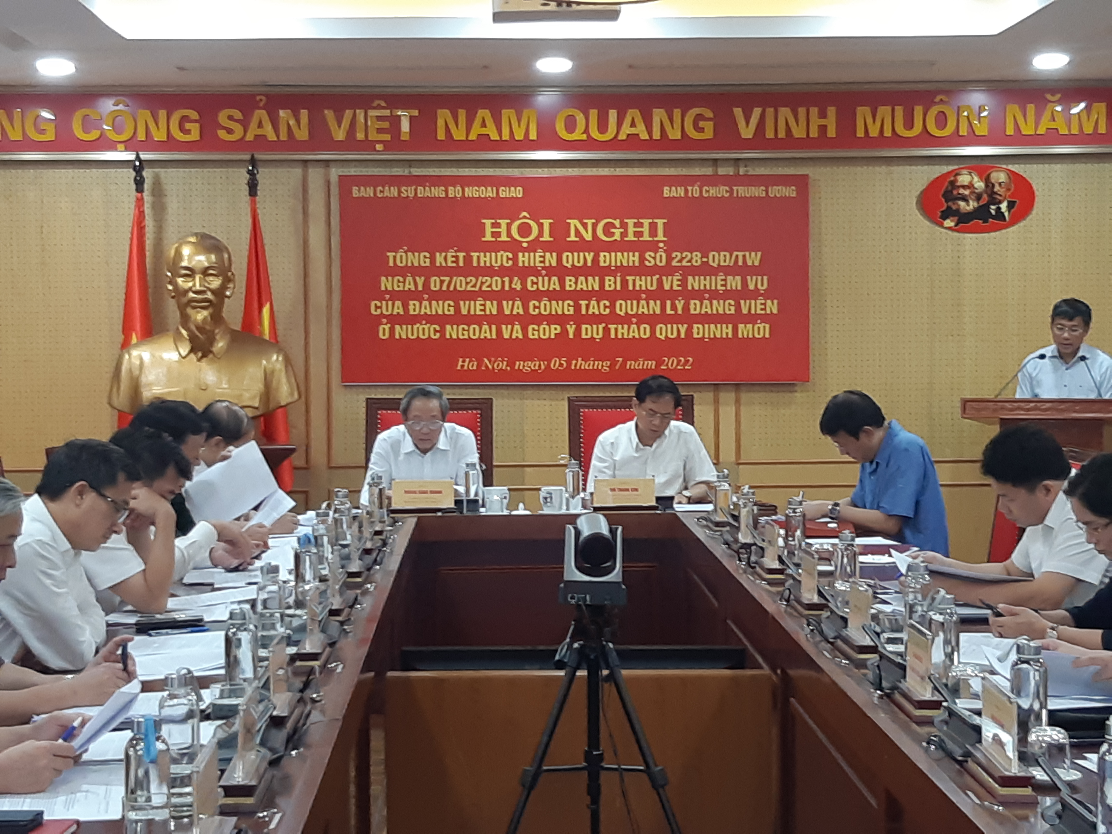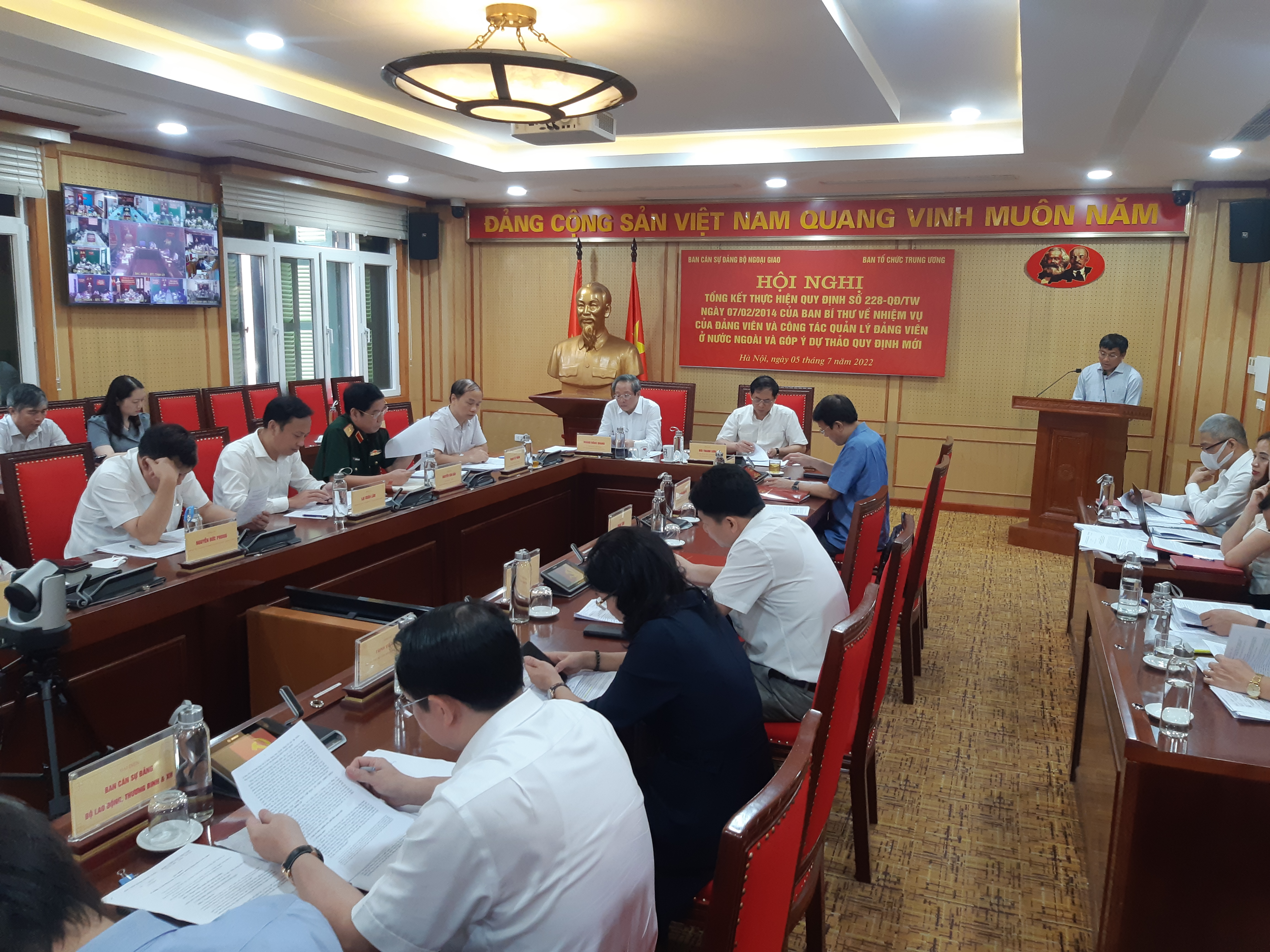 Theo Chương trình làm việc của Bộ Chính trị, Ban Bí thư năm 2022, Ban cán sự đảng Bộ Ngoại giao được giao xây dựng Đề án sửa đổi, bổ sung và ban hành Quy định mới thay thế Quy định 228-QĐ/TW ngày 07/02/2014 của Ban Bí thư về nhiệm vụ của đảng viên và công tác quản lý đảng viên ở nước ngoài.