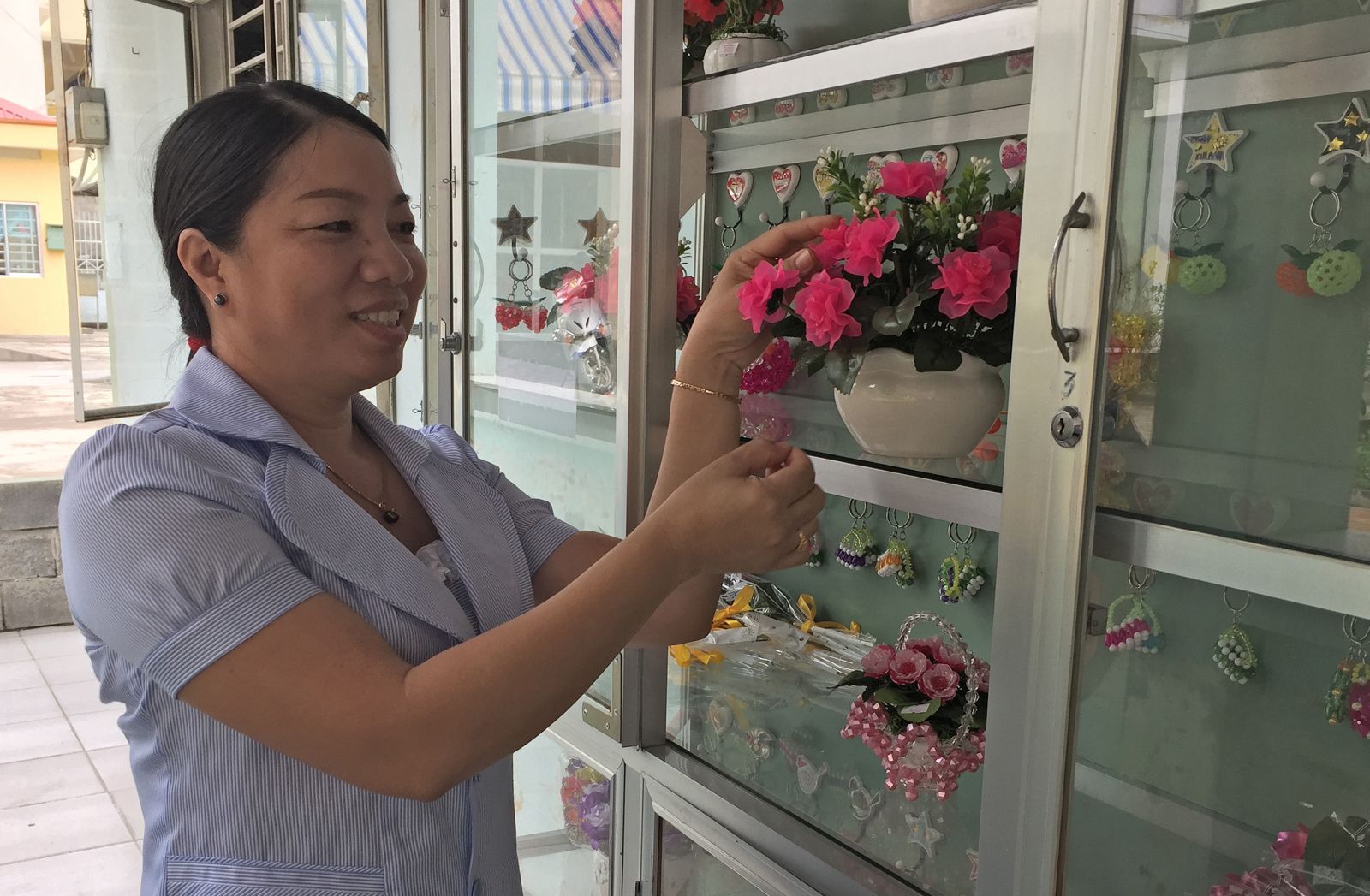 Chị Tuyết sắp xếp tủ trưng bày sản phẩm thủ công do nhân viên Trung tâm CTXH thành phố hướng dẫn các đối tượng thực hiện. Ảnh: THẢO MỘC