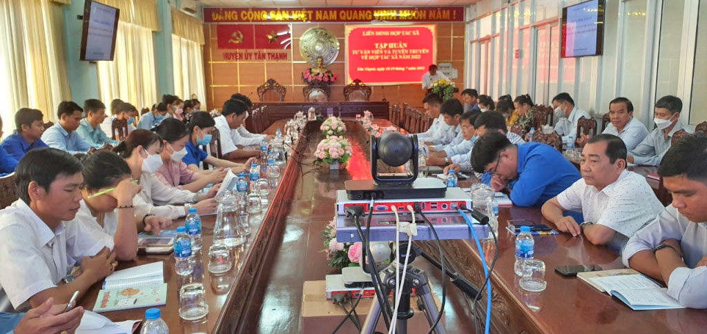 Thời gian qua, Liên minh HTX tỉnh luôn chú trọng, quan tâm đào tạo, bồi dưỡng nguồn nhân lực, đào tạo TVV, TTV cho đối tượng là cán bộ đoàn thể xã, phường, thị trấn và ban chỉ đạo KTTT huyện, thị xã, thành phố về Luật HTX năm 2012. Đây được xem là chiến lược lâu dài trong công tác cán bộ đối với lĩnh vực KTTT. Vì vậy, ngay từ đầu năm 2022, Liên minh HTX tỉnh xây dựng kế hoạch phối hợp UBND huyện: Thủ Thừa, Đức Hòa, Tân Thạnh, thị xã Kiến Tường tổ chức các lớp tập huấn đào tạo TVV, TTV.