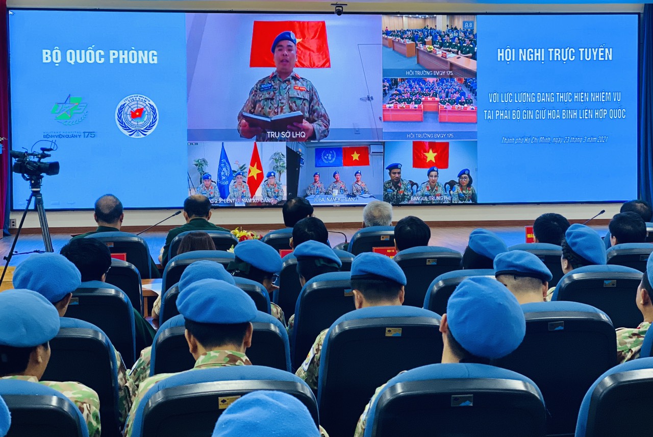 Ngày 23/3, Bộ Quốc phòng tổ chức Hội nghị trực tuyến với lực lượng Việt Nam đang thực hiện nhiệm vụ gìn giữ hòa bình Liên hợp quốc tại trụ sở Liên hợp quốc, Phái bộ Cộng hòa Trung Phi và Cộng hòa Nam Xu-đăng. Đồng chí Thượng tướng Hoàng Xuân Chiến, Ủy viên Trung ương Đảng, Ủy viên Quân ủy Trung ương, Thứ trưởng Bộ Quốc phòng chủ trì Hội nghị.