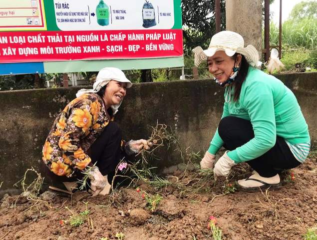 Hội viên nông dân phường Long Phước, quận 9 trồng hoa trên tuyến đường đăng ký không xả rác
