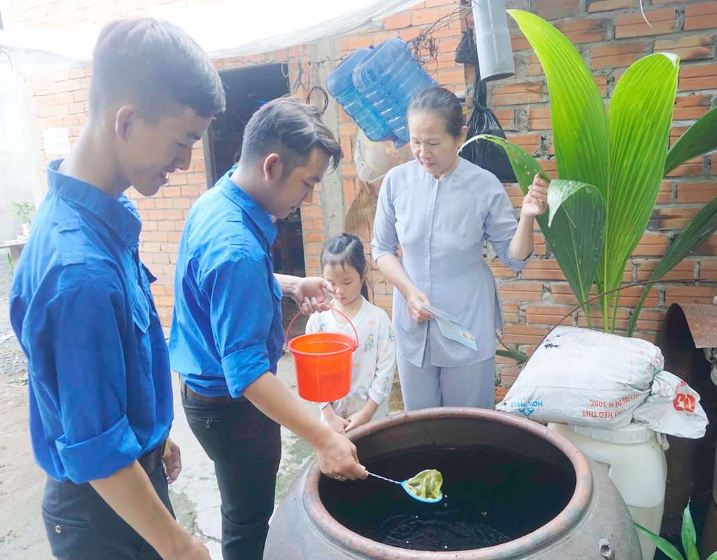 Cán bộ trạm y tế và đoàn viên, thanh niên xã Tân Bửu hướng dẫn người dân diệt lăng quăng