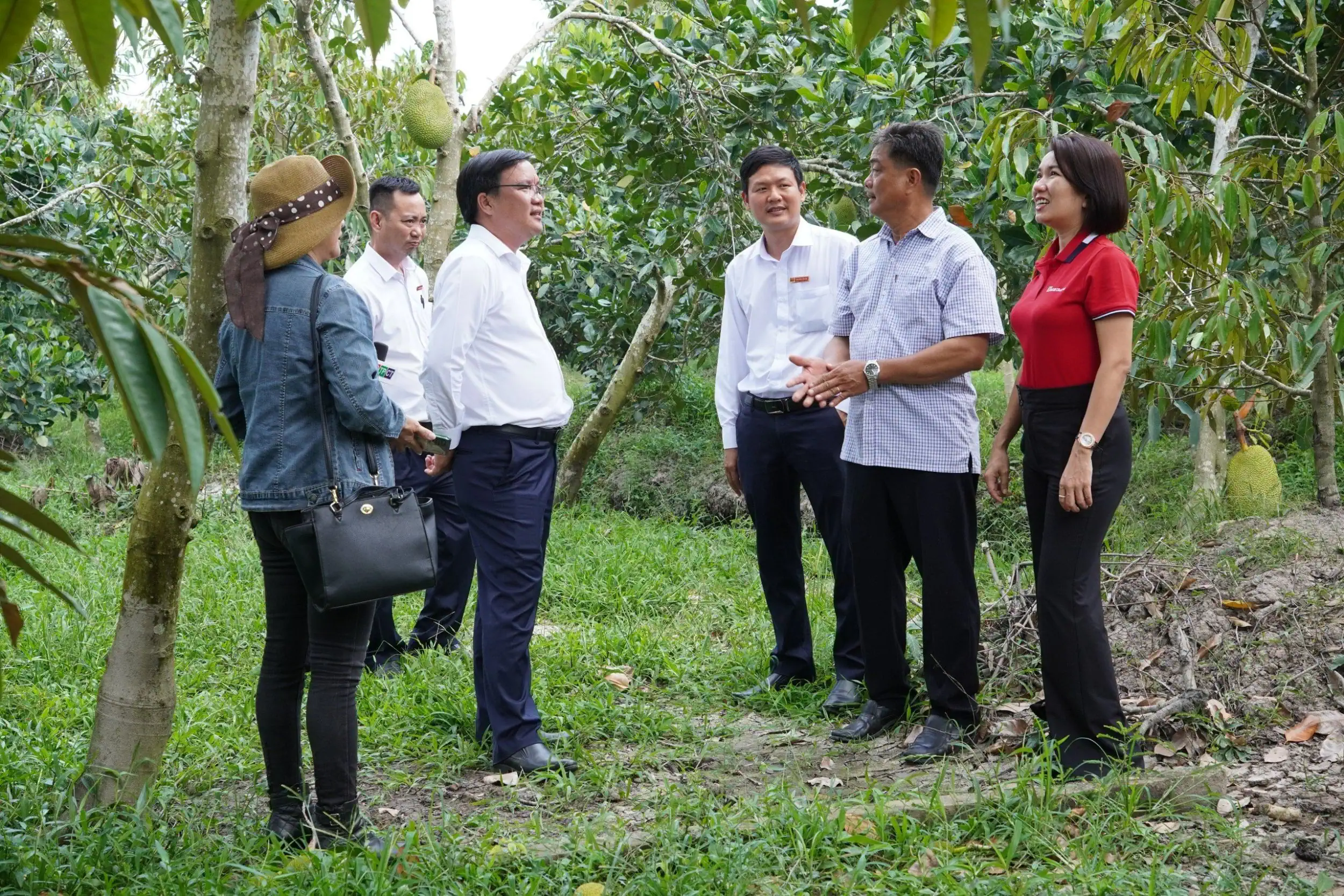 Anh Nguyễn Hữu Tấn (thứ 2 từ phải sang) giới thiệu với cán bộ tín dụng Agribank Chi nhánh huyện Châu Thành về vườn mít Thái của gia đình.