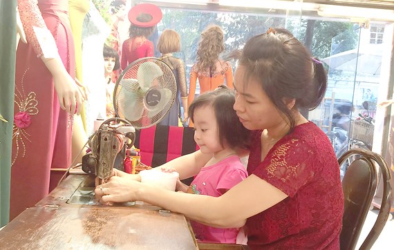 Con gái anh Vinh (chủ nhà may Thiết Lập) dù mới 3 tuổi nhưng đã có sự thích thú rõ rệt với chiếc máy may