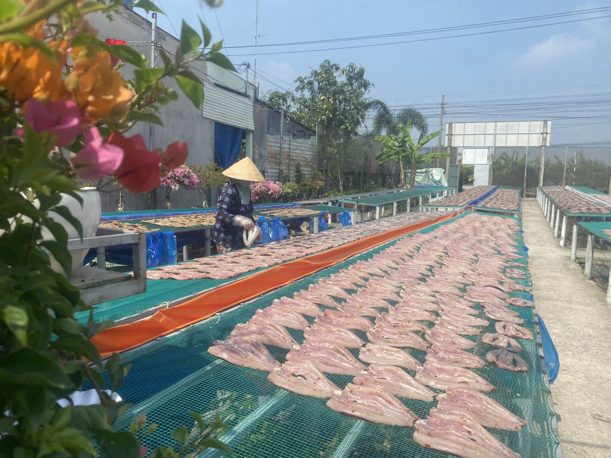 Chỉ còn hơn 1 tuần là đến Tết Nguyên đán Giáp Thìn năm 2024, những ngày này, Cơ sở khô Cô Nhàn (xã Kiến Bình, huyện Tân Thạnh) hoạt động hết công suất, việc mua bán diễn ra tất bật cả ngày lẫn đêm. Trung bình mỗi ngày, cơ sở chế biến từ 300-500kg cá khô các loại, tăng gấp 2 lần so với ngày thường để đáp ứng nhu cầu của thị trường tết. Hiện cơ sở nhận rất nhiều đơn hàng trong và ngoài tỉnh với số lượng tăng lên theo cấp số nhân, giải quyết việc làm thường xuyên cho khoảng 10 lao động ở địa phương với thu nhập 240.000 đồng/người/ngày.