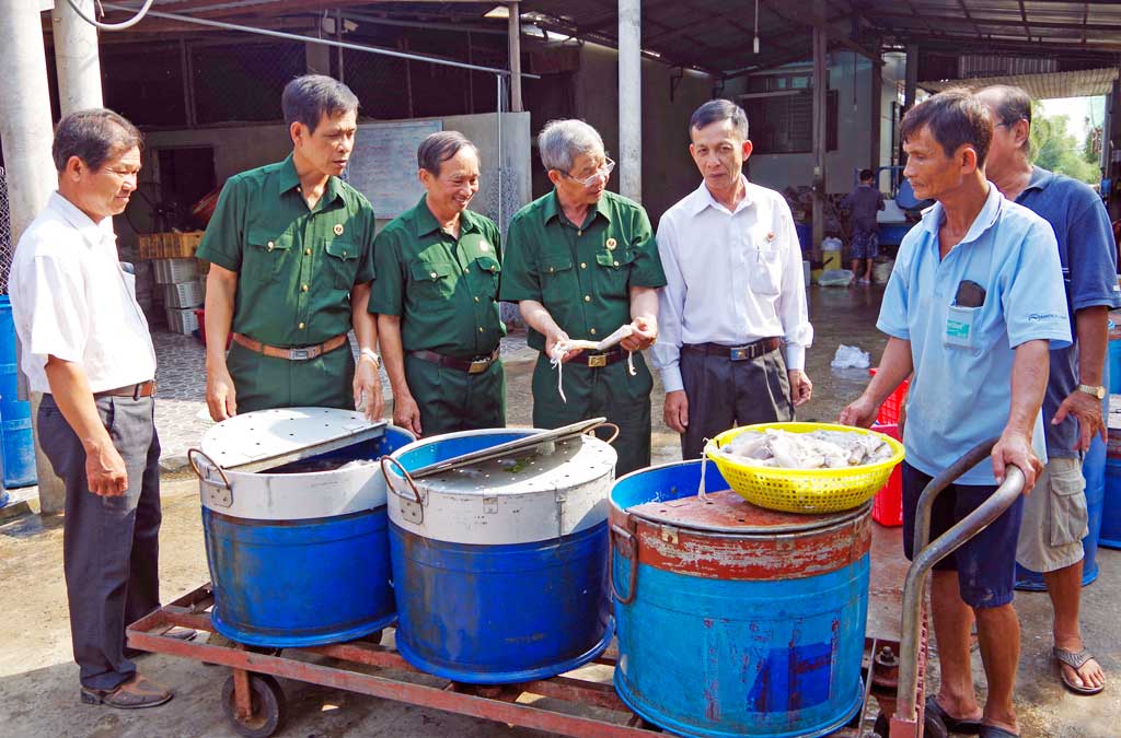 Cựu chiến binh Ngô Hoài Phong (đeo kính) hướng dẫn kỹ thuật chế biến hải sản cho các hội viên cựu chiến binh