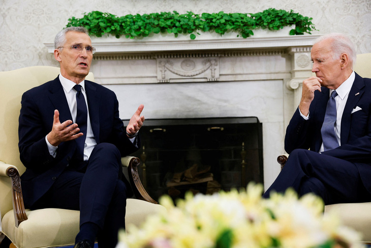 Tổng thư ký NATO Jens Stoltenberg (trái) trong cuộc gặp với Tổng thống Mỹ Joe Biden - Ảnh: REUTERS
