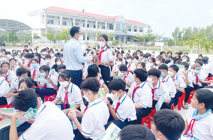 Bác sĩ Trung tâm Y tế huyện U Minh Thượng tuyên truyền về giáo dục sức khỏe và giới tính cho học sinh Trường Trung học cơ sở Minh Thuận 2, xã Minh Thuận, huyện U Minh Thượng.