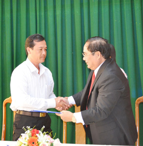 | Đại diện Công ty Cổ phần Xây dựng số 8, TP Hồ Chí Minh (bên phải) ký kết hỗ trợ xã Vĩnh Bình, huyện Vĩnh Thạnh, TP Cần Thơ XD NTM. Ảnh: T.LONG |