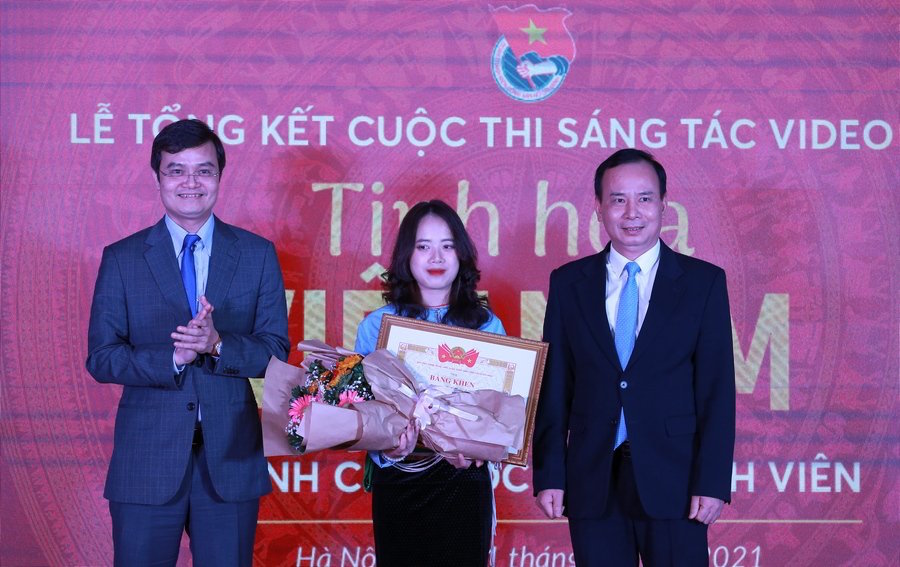| Ủy viên dự khuyết Trung ương Đảng, Bí thư thường trực Trung ương Đoàn Bùi Quang Huy và Phó Trưởng ban Dân vận Trung ương Nguyễn Lam trao giải Nhất cho thí sinh Bùi Mai Anh |