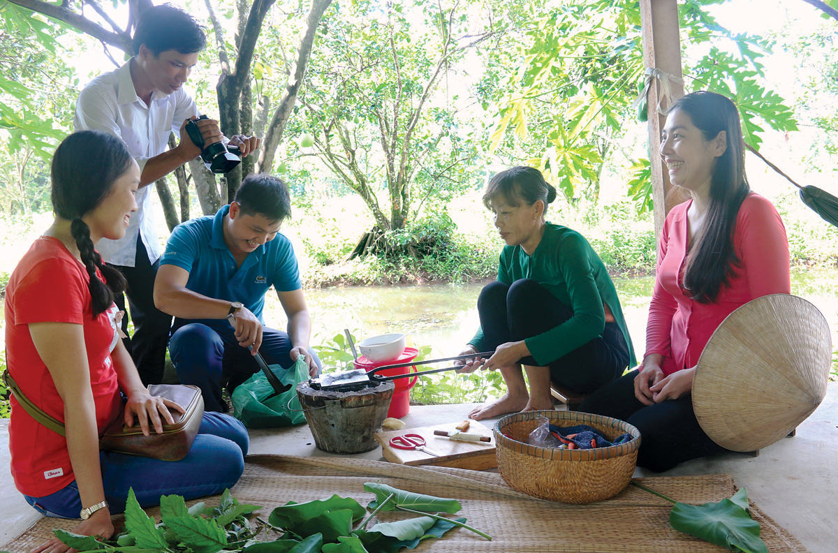 Du khách thích thú trải nghiệm làm bánh dân gian cùng người dân Cồn Sơn. Ảnh: DUY KHÔI