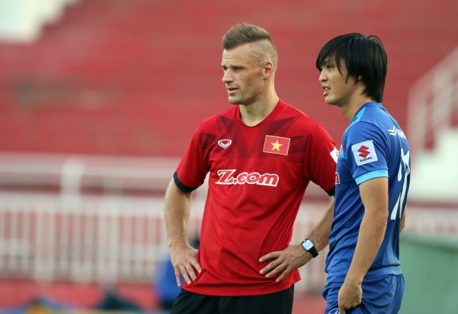 Tuấn Anh (phải) trong buổi tập cuối tại TP.HCM trước khi cùng tuyển VN bay sang Myanmar. Ảnh: N.Khôi